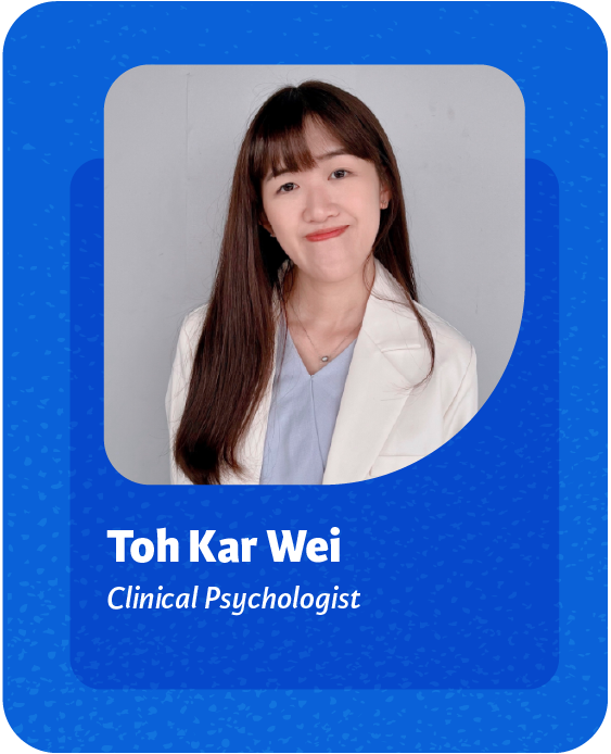 Toh Kar Wei, is a Clinical Psychologist, affiliated with esteemed organizations such as the Malaysian Society of Clinical Psychology (MSCP), the Malaysian Allied Health Professions Council, and the Persatuan Psikologi Malaysia (PSIMA). With a rich background in clinical psychology, Toh Kar Wei has traversed various roles, from internships at the University of Cyberjaya Health and Psychology Clinic to her current position as Associate Clinical Psychologist at Relationary. She remains dedicated to professional development, actively engaging in workshops and programs such as Behavior Disorders in Children and the National Conference on Mental Health & WellBeing to continuously enhance her knowledge and skills. As an invited speaker for talks and workshops, Toh Kar Wei shares her expertise on various topics, including Emotional Management and Understanding Children’s Development, contributing to the broader discourse on mental health awareness and support.